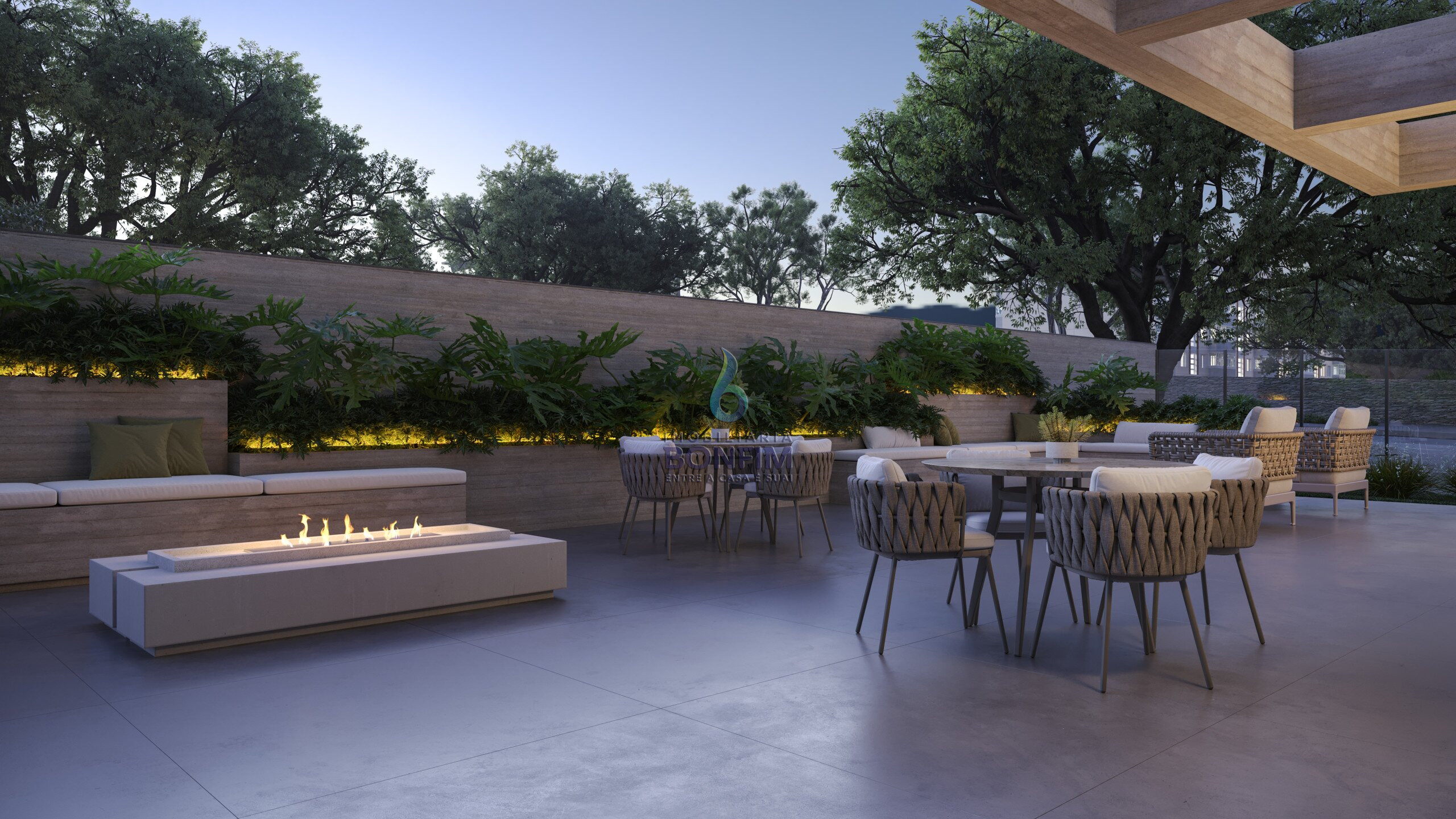 Estar externo salão de festas com fire place;
