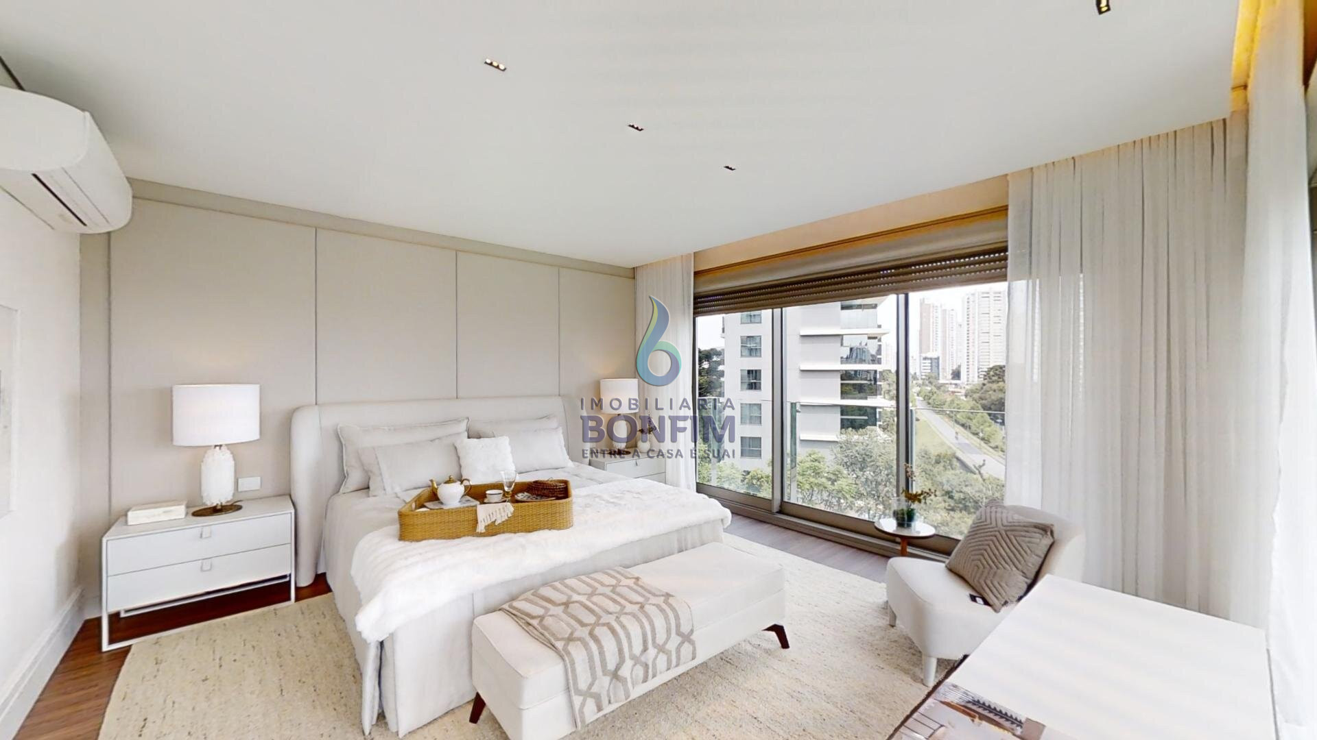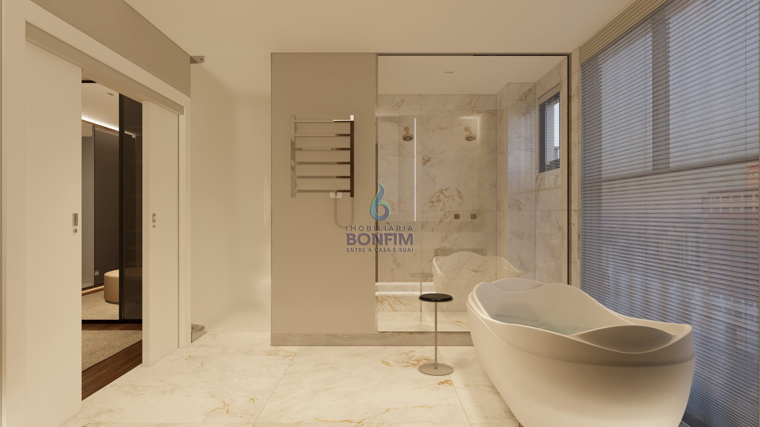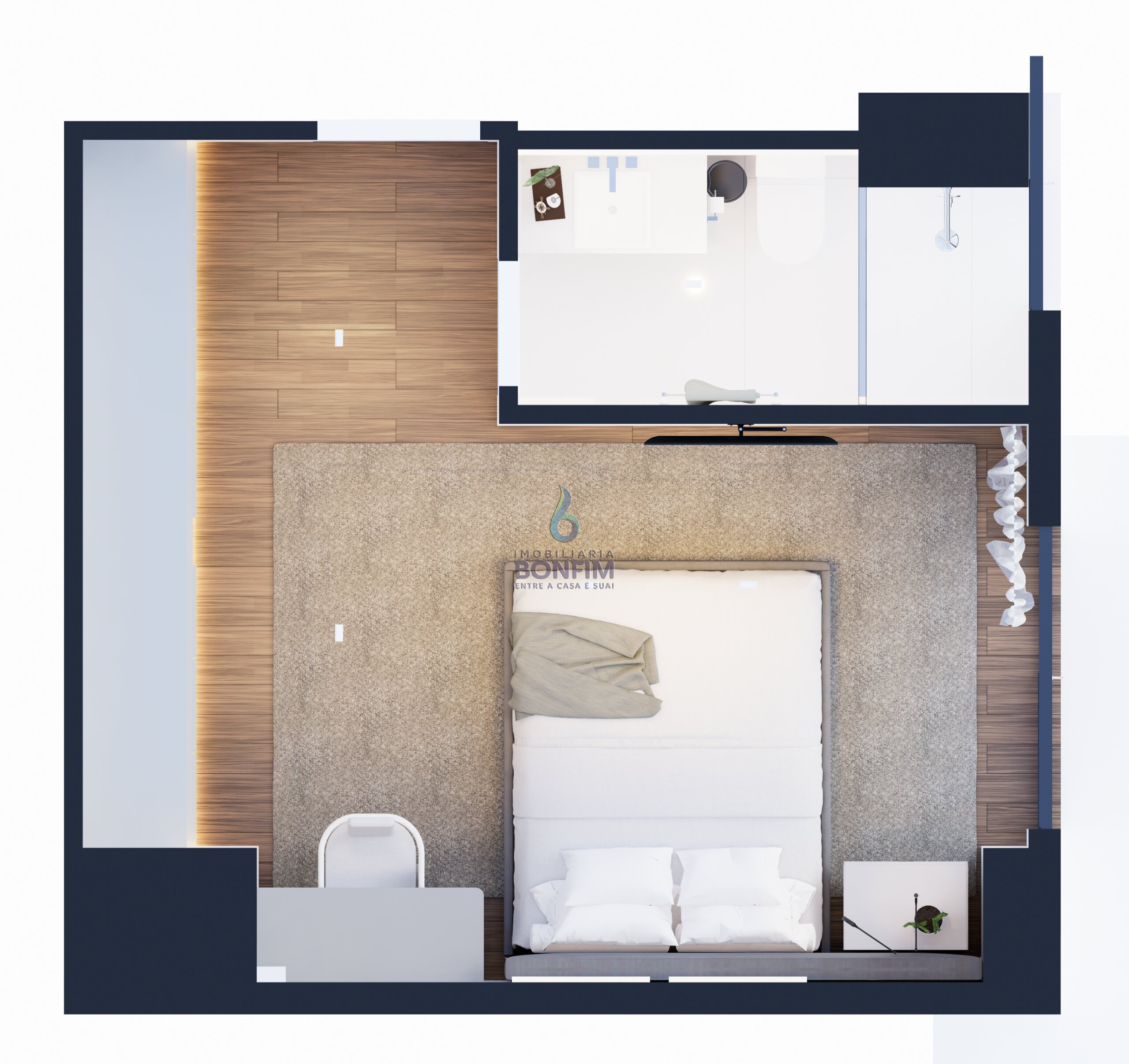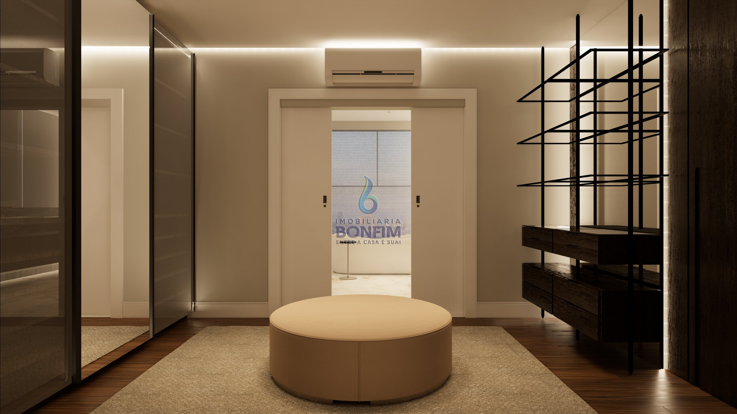 A suíte master oferece um verdadeiro refúgio particular, com banheira para momentos de relaxamento e amplo espaço para closet.