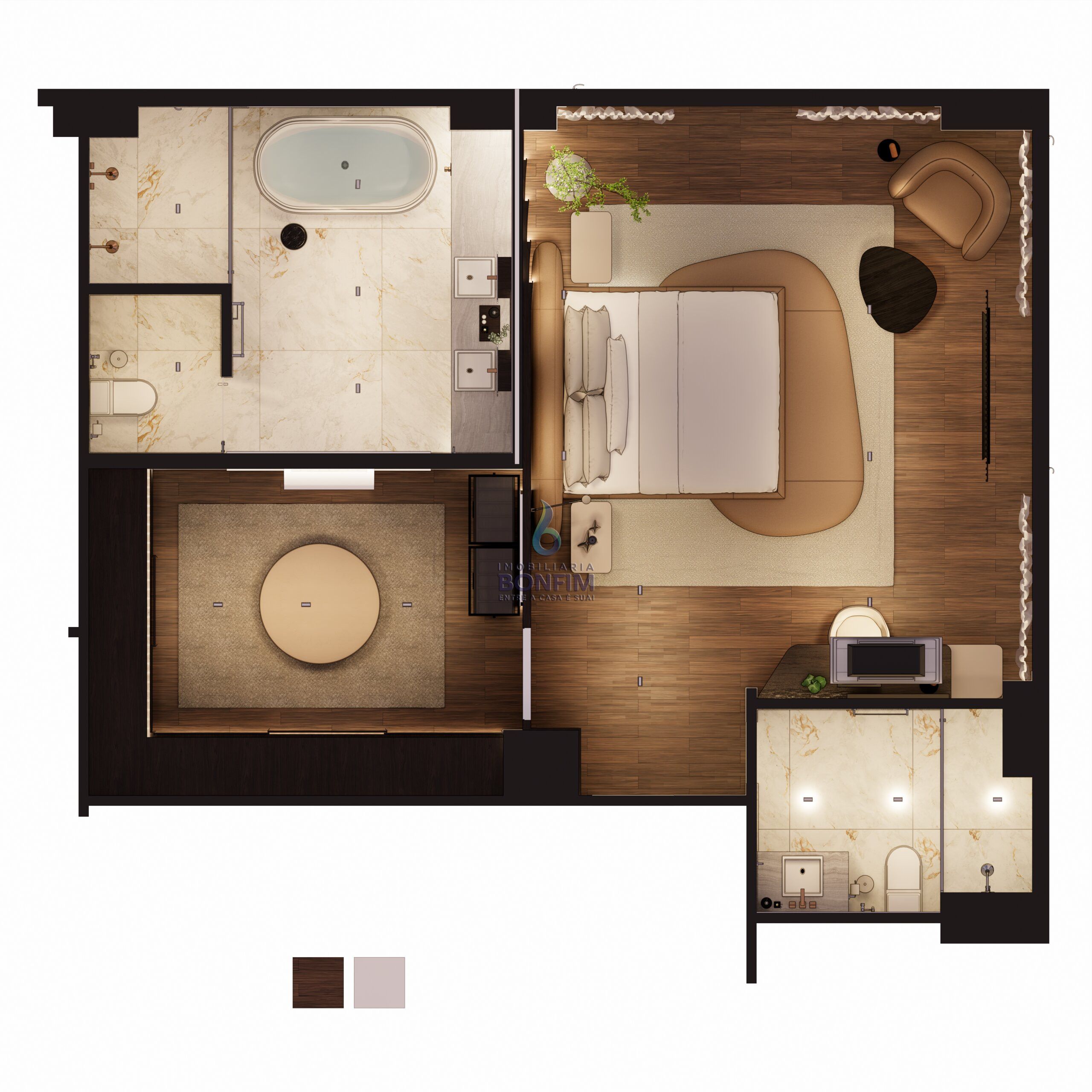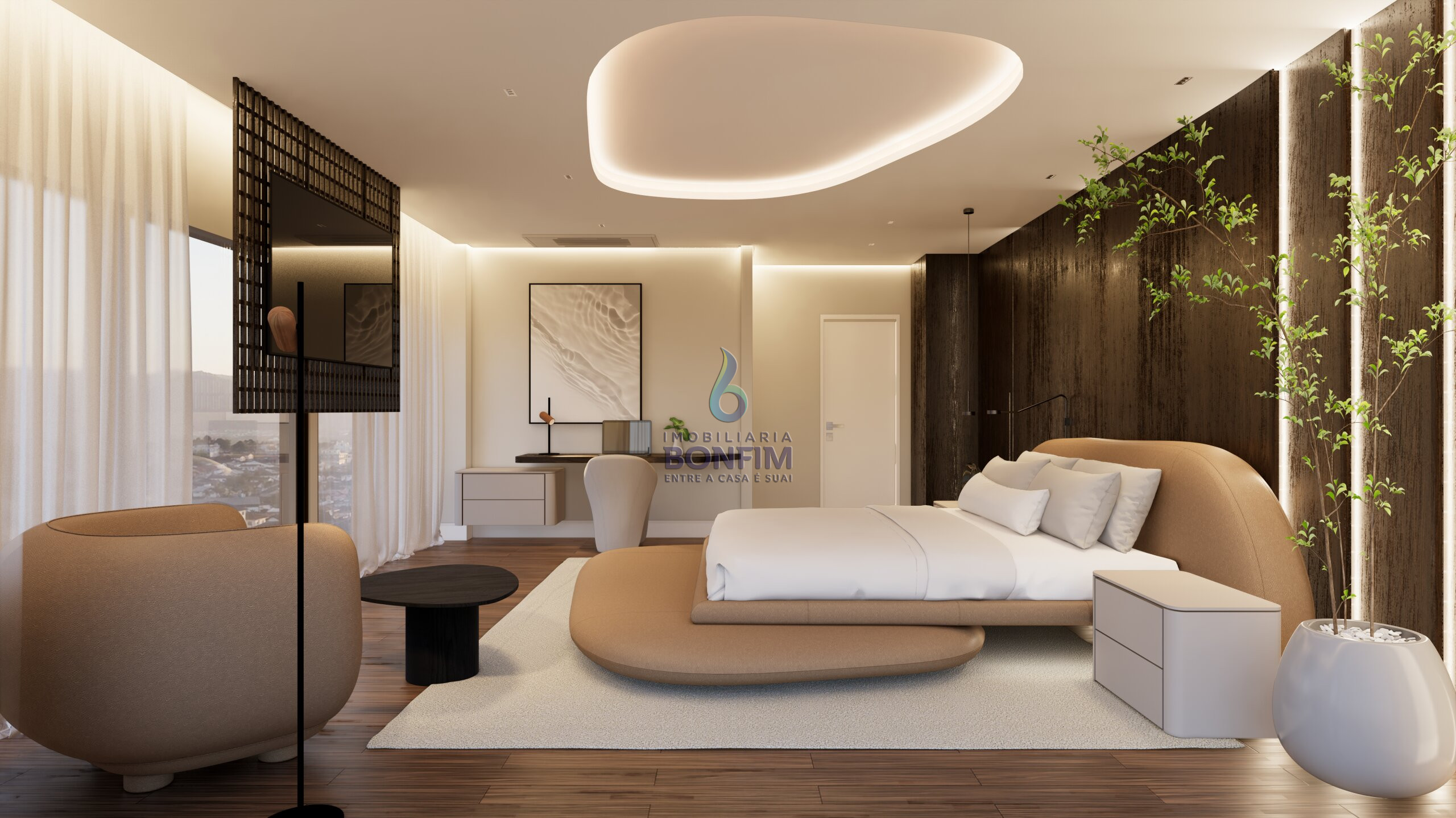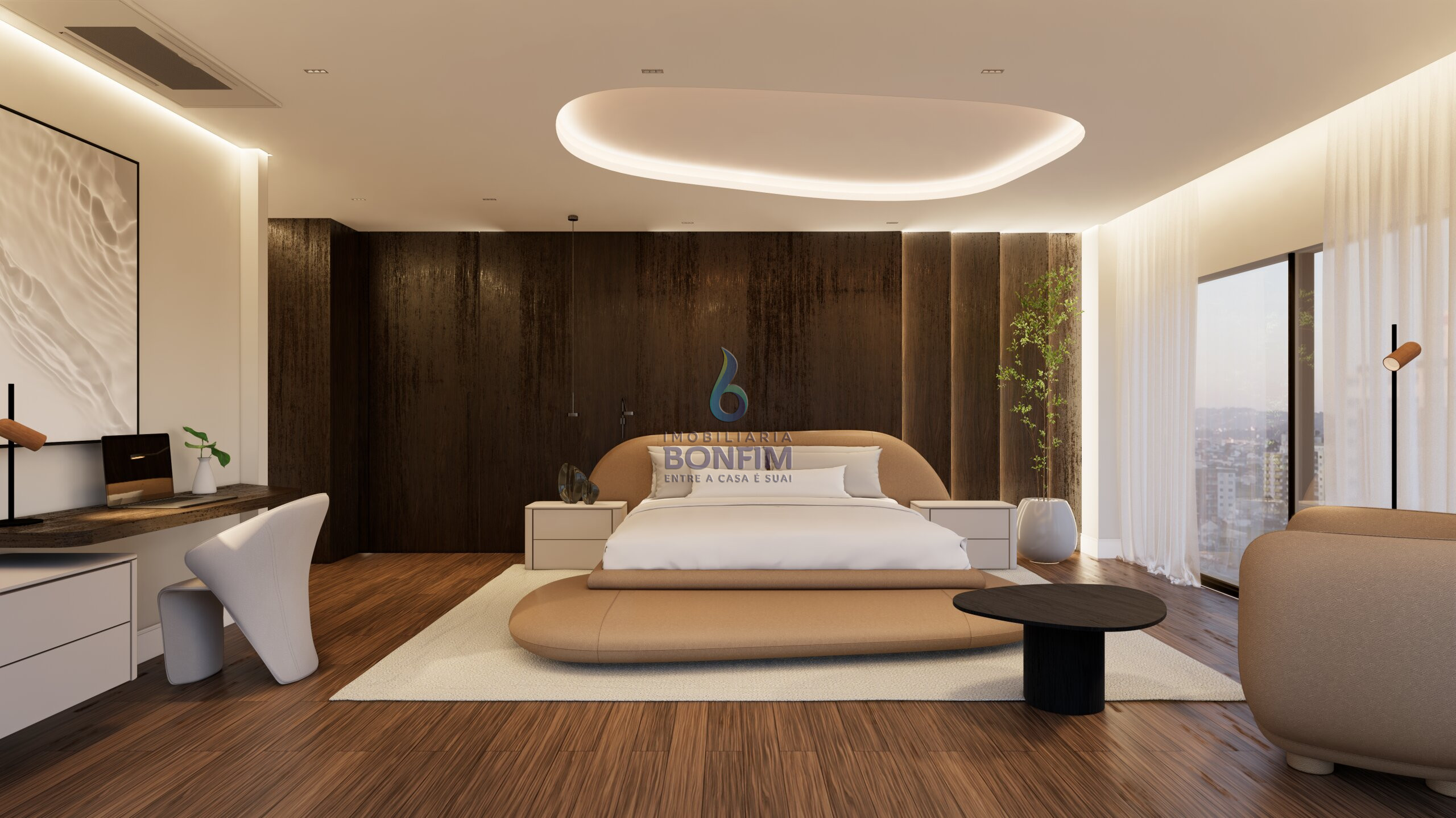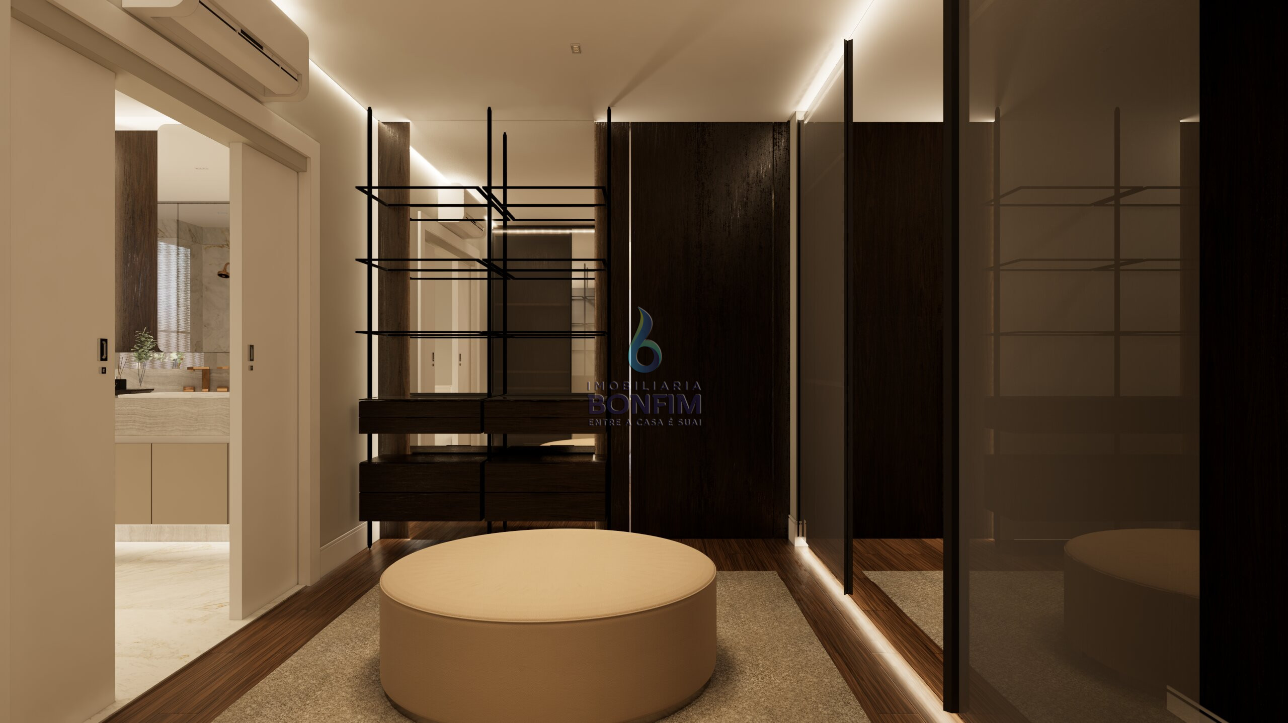 A suíte master oferece um verdadeiro refúgio particular, com banheira para momentos de relaxamento e amplo espaço para closet.