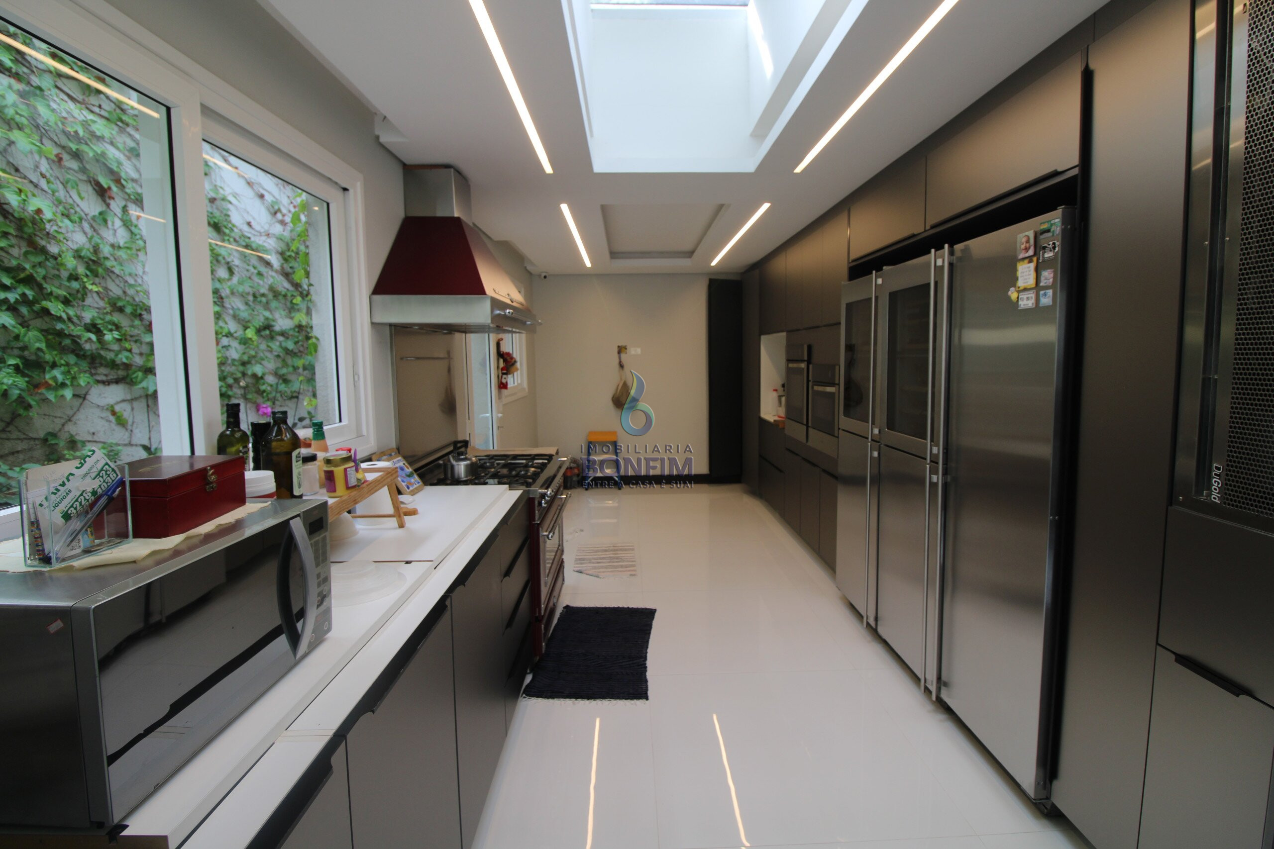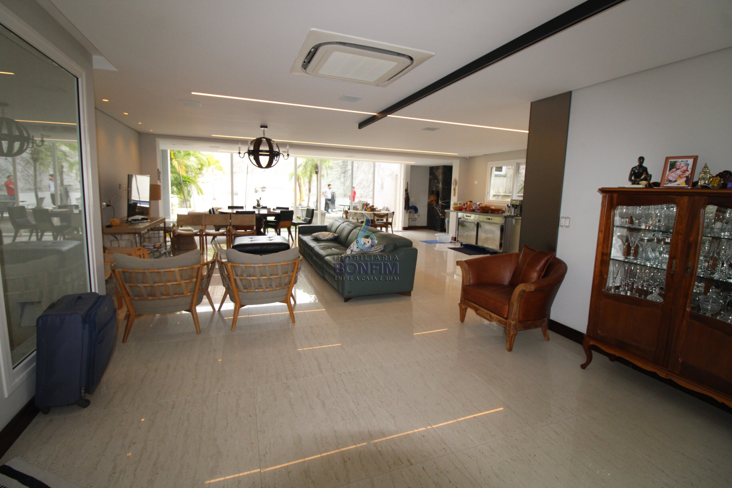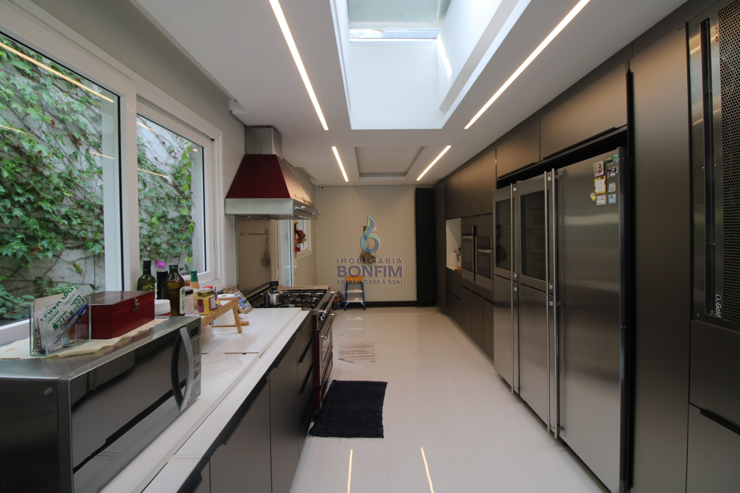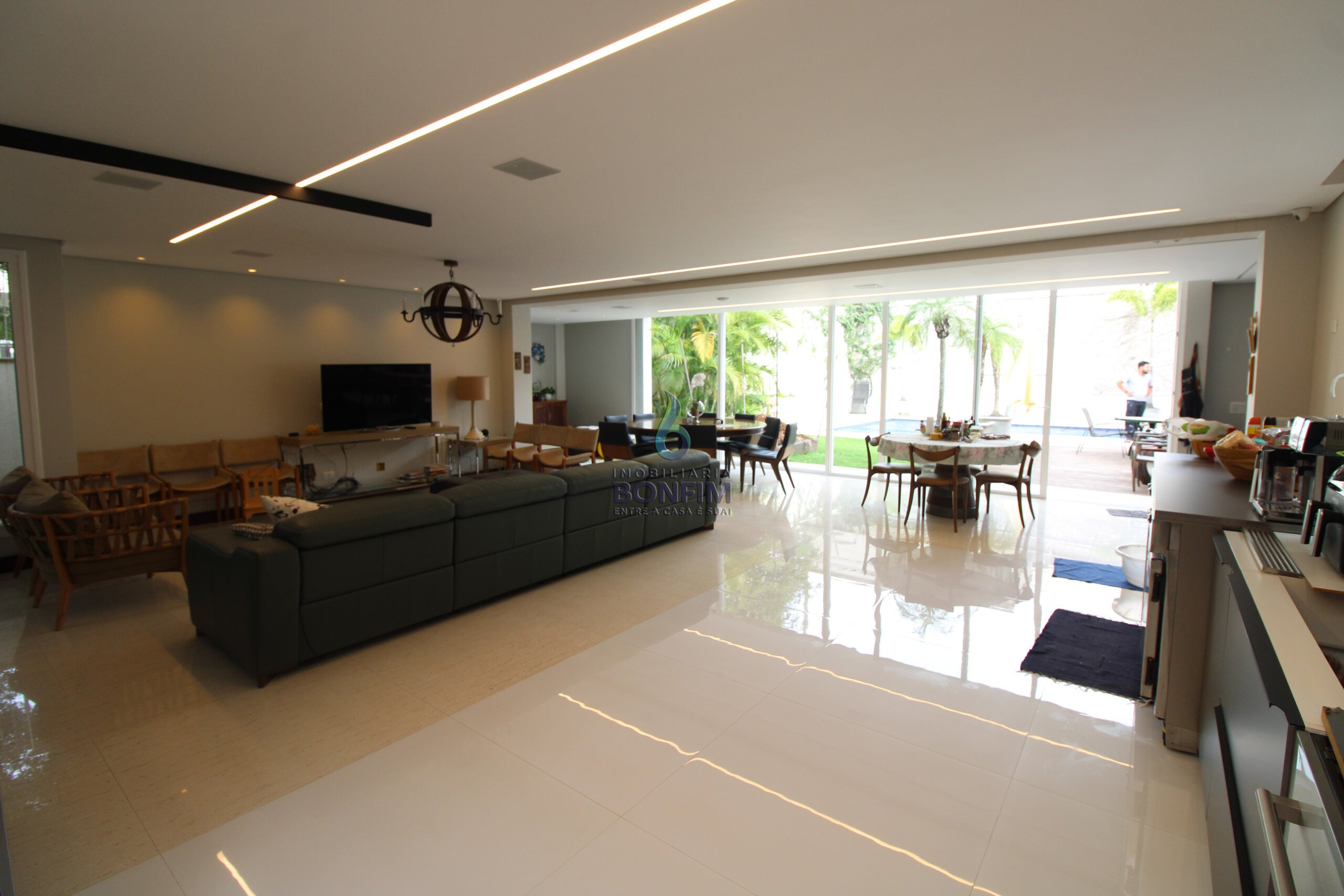 Ampla cozinha rica em armários com conceito todo aberto onde conecta com a sala de jantar com vista para piscina e quintal. Despensa e áreas de serviço.